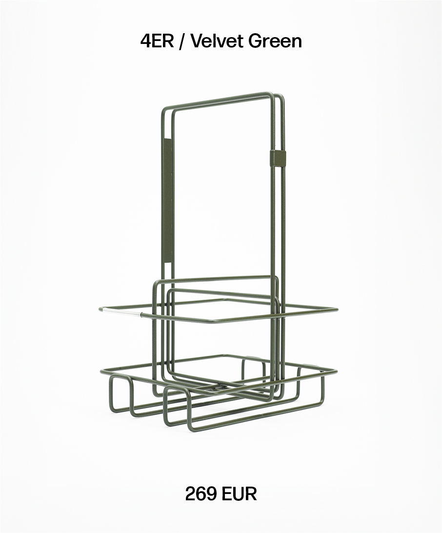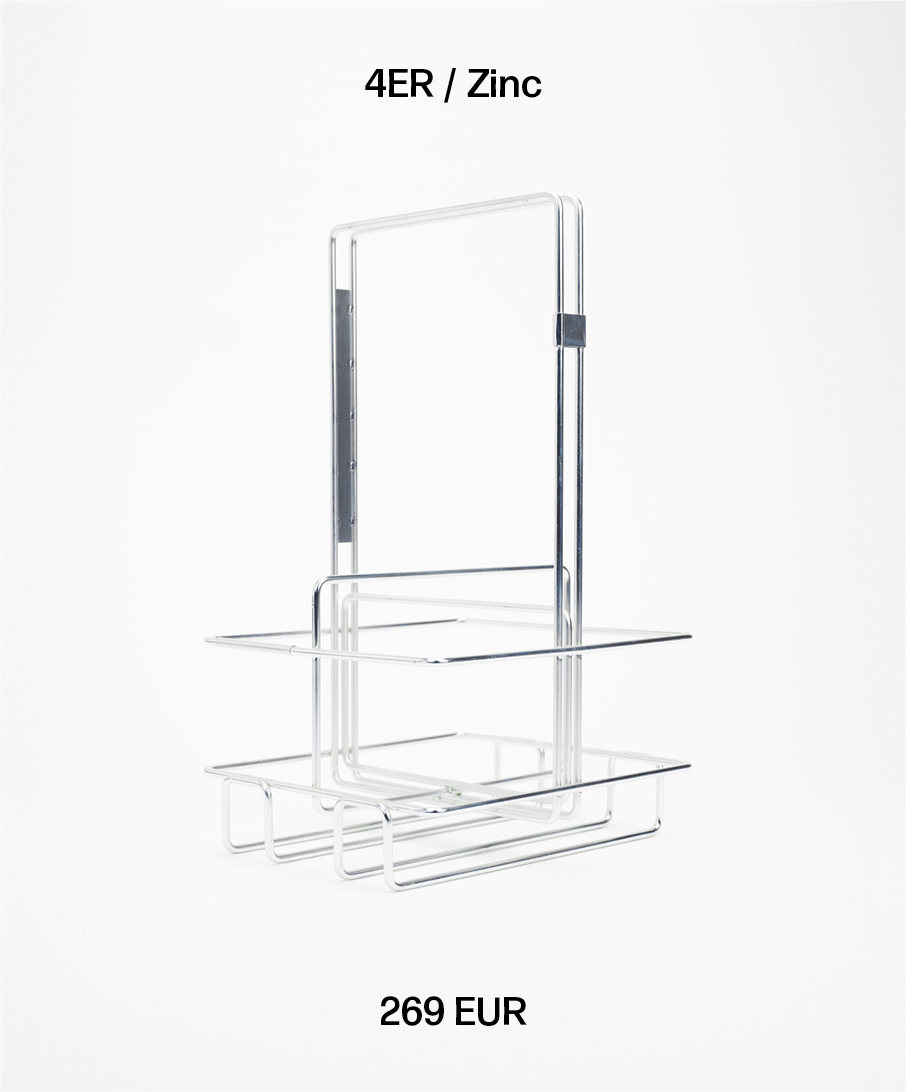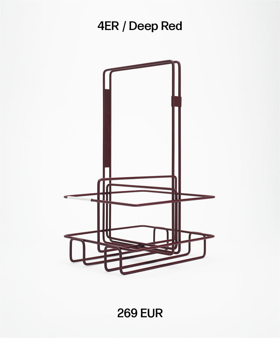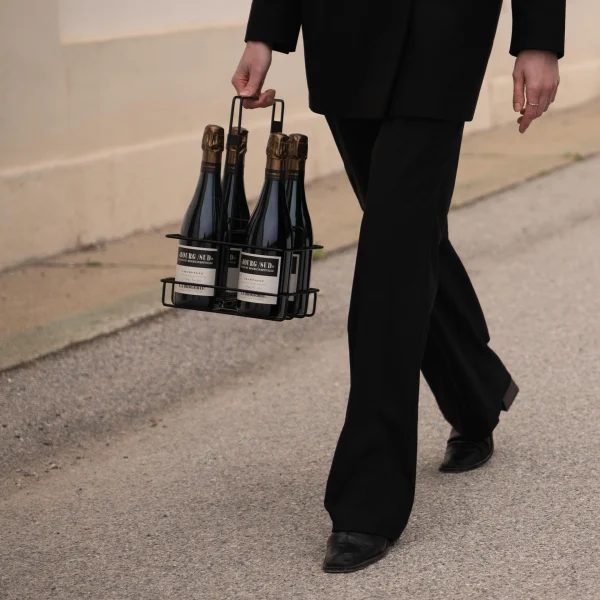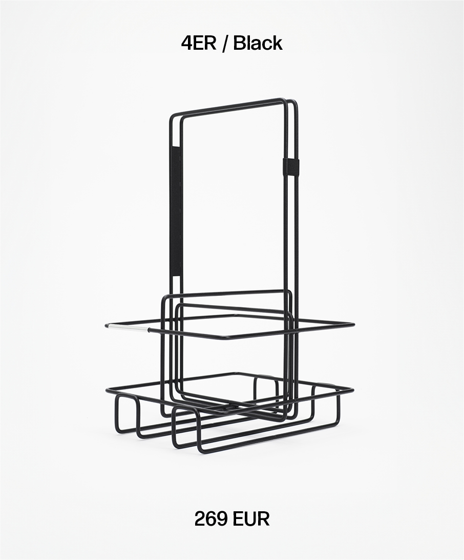 A modern, elegant wine bottle holder crafted from powder-coated steel, designed to fit 4 bottles.